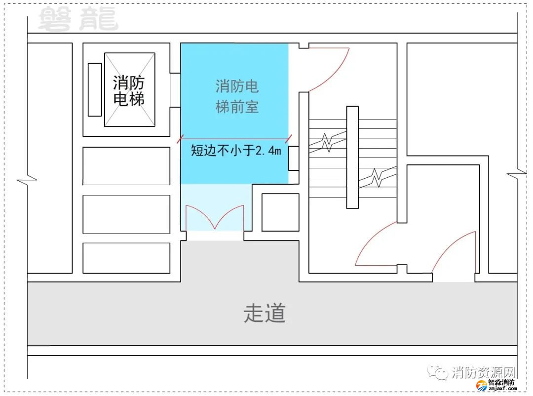 消防電梯前室的短邊不應(yīng)小于2.4m,主要是為了滿(mǎn)足消防員整裝和擔(dān)架運(yùn)輸?shù)裙δ芤?,前室的面積和尺寸應(yīng)是與消防電梯門(mén)正對(duì)的規(guī)則區(qū)域,不應(yīng)通過(guò)過(guò)道、拐角等擴(kuò)展區(qū)域來(lái)實(shí)現(xiàn)。