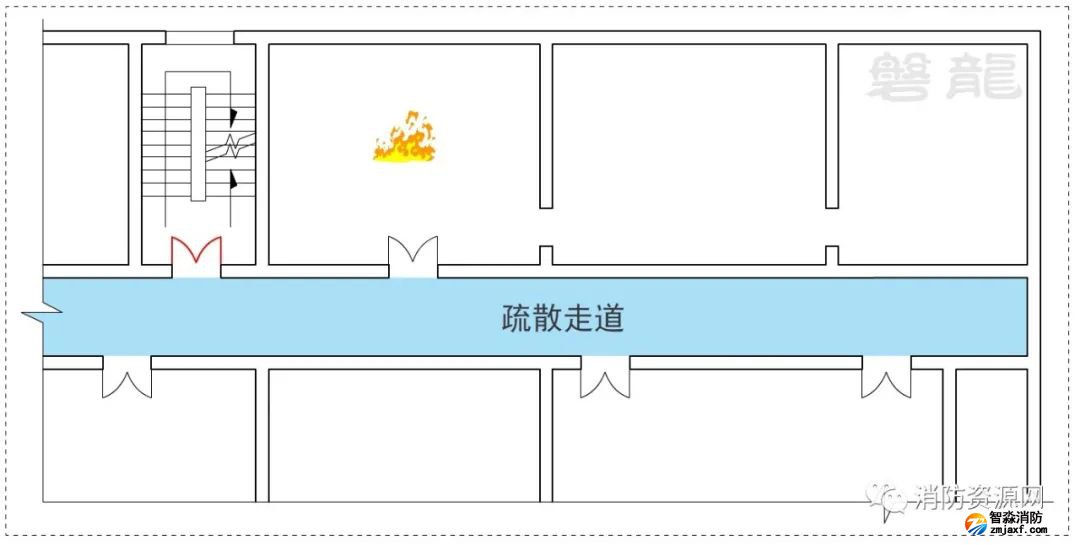 三、人員疏散過程中,從危險區(qū)域(房間等)應進入次危險區(qū)域(疏散走道等)或相對安全區(qū)域、安全區(qū)域,不應通過其他危險區(qū)域疏散,示例: