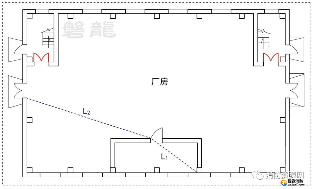 2廠房倉庫同樣不應采用嵌套(穿套)設置的方式,確因功能需要,嵌套(穿套)設置的房間不應超過一級,疏散距離應按人員行走的直線距離計算,在圖示7的廠房中,示例房間內任一點至安全出口的直線距離,應為L1+L2。