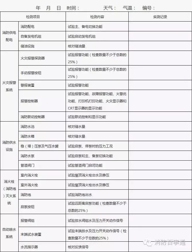 2、發(fā)現(xiàn)的問題或存在故障應(yīng)在“實(shí)測記錄”欄中填寫,并及時處置;當(dāng)場不能處置的要填報(bào)《建筑消防設(shè)施故障處理登記表》;