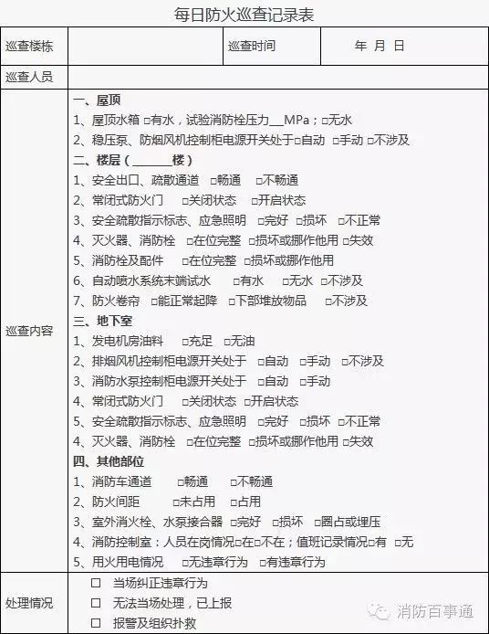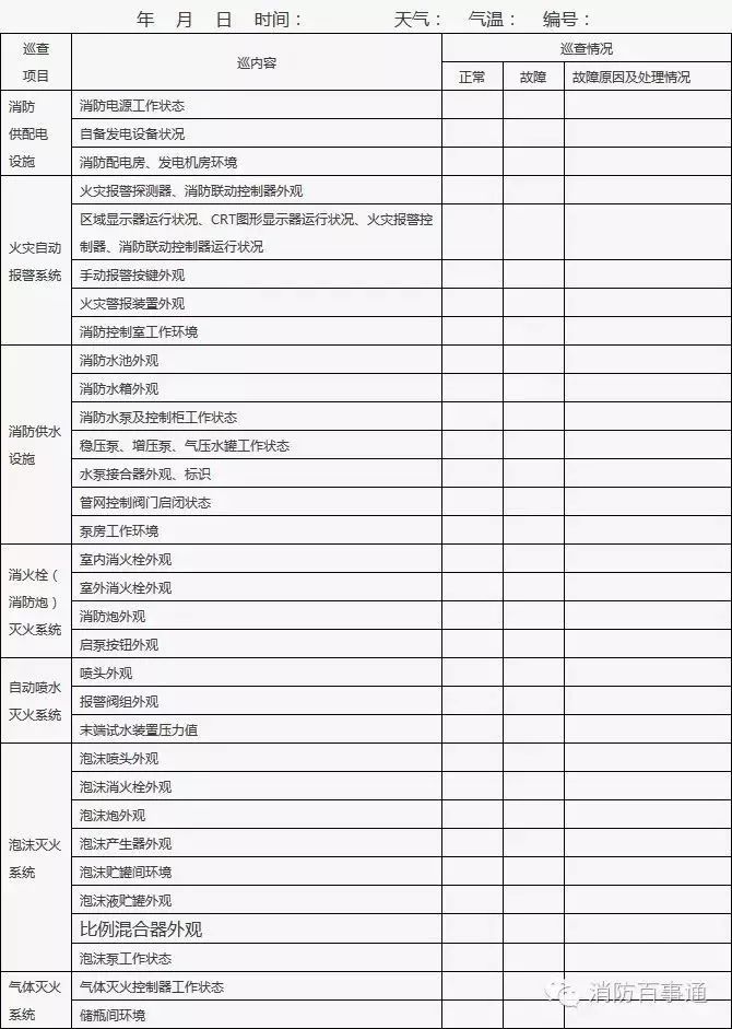 1、建筑消防設(shè)施巡查應(yīng)明確各類建筑消防設(shè)施巡查部位,巡查應(yīng)當(dāng)每周至少一次,并填表。依法開展每月防火巡查的單位和設(shè)有電子巡查更系統(tǒng)的單位,應(yīng)將建筑消防設(shè)施巡查部位納入其中。
