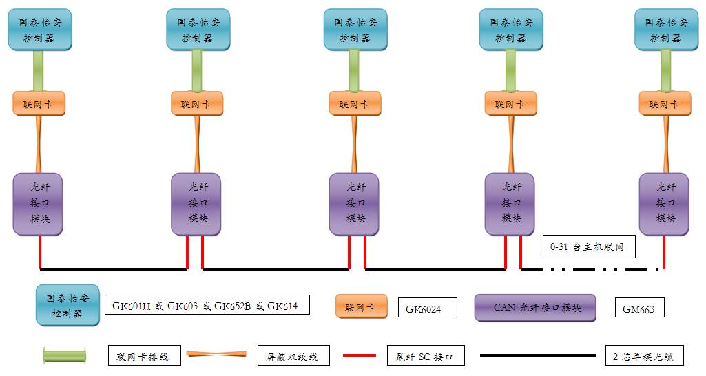2) 串聯(lián)接線方式只須增加本公司GM663光纖接口模塊與聯(lián)網(wǎng)卡GK6024,每臺控制器配接2個。