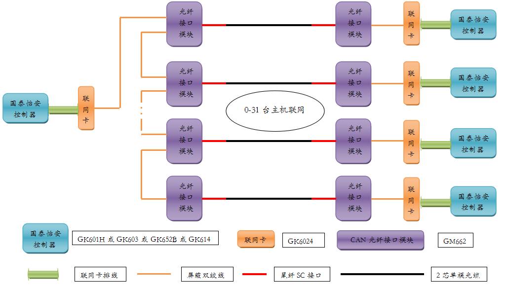 3) 星型接線方式控制器主機須根據(jù)對應(yīng)的控制器分機的數(shù)量決定GM662光纖接口模塊,如果控制器分機4臺,那么主機配接接口模塊GM662數(shù)量為4,聯(lián)網(wǎng)卡為1,4臺分機配接接口模塊GM662數(shù)量為4,聯(lián)網(wǎng)卡為4。