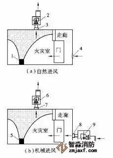 1,5-火源;2,6-排煙風(fēng)機(jī);3,7-排煙口;4,8-進(jìn)(送)風(fēng)口;9-通風(fēng)機(jī)