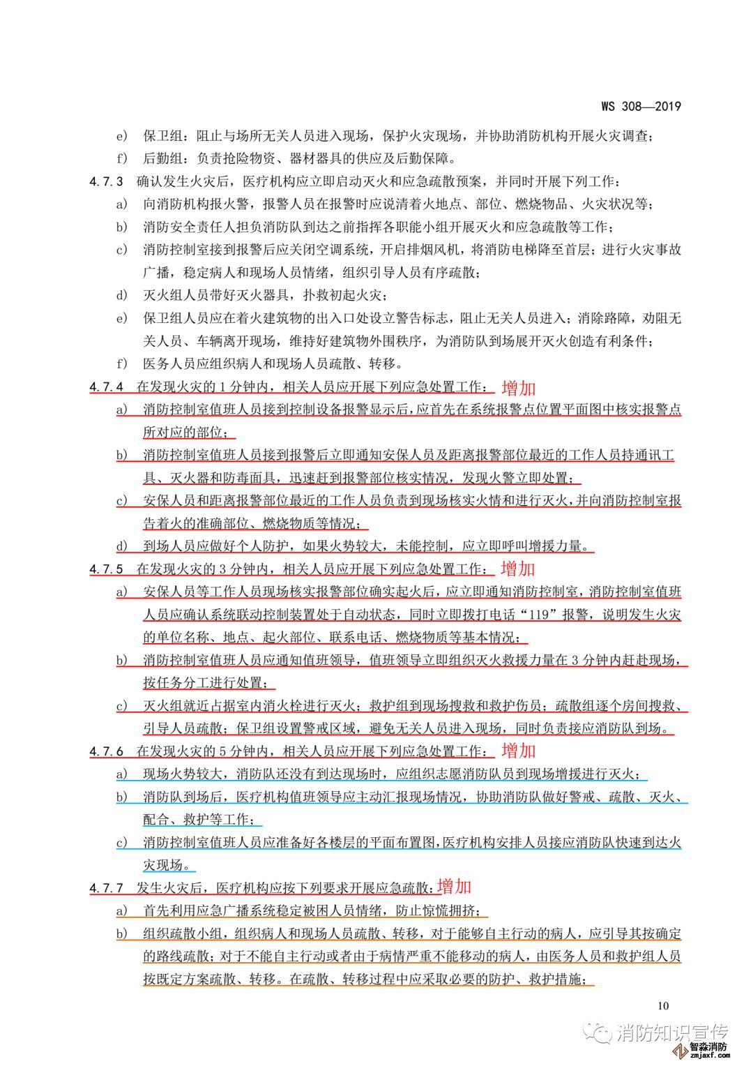 ——增加了發(fā)現(xiàn)火災(zāi)的1分鐘內(nèi)、 3分鐘內(nèi)、 5分鐘內(nèi)的應(yīng)急處置工作要求和發(fā)生火災(zāi)后醫(yī)療機(jī)構(gòu)開展應(yīng)急疏散要求(見4.7.4、 4.7.5、 4.7.6和4.7.7);