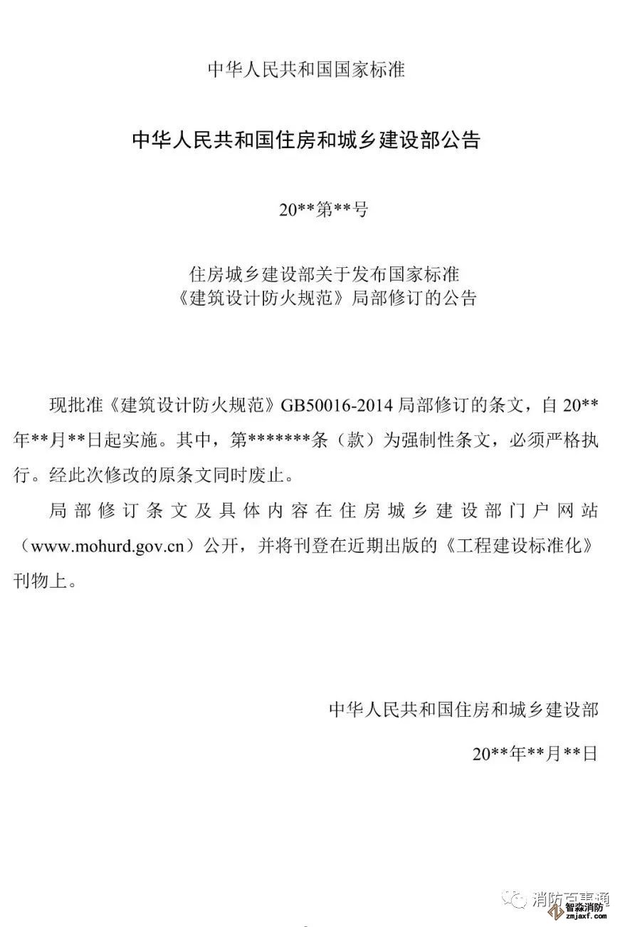 現(xiàn)批準(zhǔn)《建筑設(shè)計防火規(guī)范》GB 50016-2014局部修訂的條文,自20**年**月**日起實施。其中,第*******條(款)為強制性條文,必須嚴(yán)格執(zhí)行。經(jīng)此次修改的條文同時廢止。