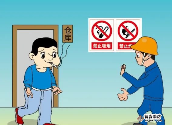 8. 生產(chǎn)車間、原料及成品庫房禁止攜帶火種進入,禁止動用明火、禁止吸煙,設(shè)置醒目的嚴禁煙火警示牌。