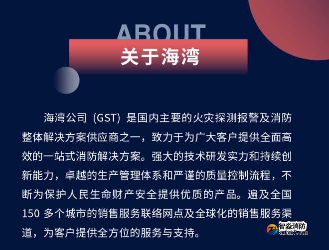 海灣公司(GST)是國內(nèi)主要的火災探測報警及消防整體解決方案供應商之一,致力于為廣大客戶提供全面高效的一站式消防解決方案。強大的技術研發(fā)實力和持續(xù)創(chuàng)新能力,卓越的生產(chǎn)管理體系和嚴謹?shù)馁|(zhì)量控制流程,不斷為保護人民生命財產(chǎn)安全提供優(yōu)質(zhì)的產(chǎn)品。遍及全國150 多個城市的銷售服務聯(lián)絡網(wǎng)點及全球化的銷售服務渠道,為客戶提供全方位的服務與支持。