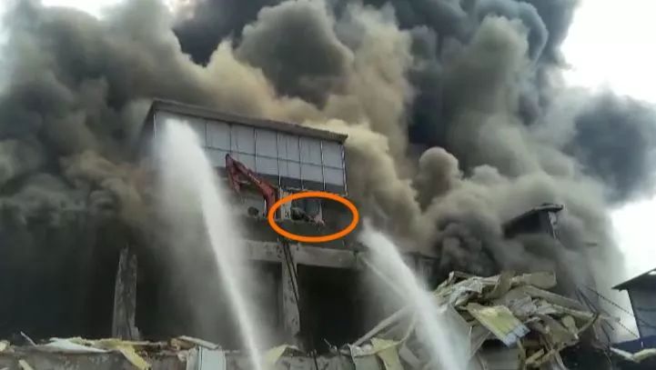 廠房頂部一架挖機(jī)上兩名施工人員被困樓頂,消防人員進(jìn)入火場,對被困人員進(jìn)行施救。