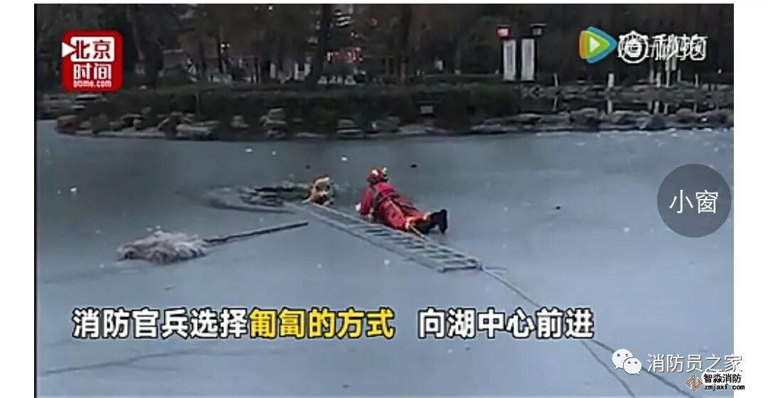 2月7日,西安一只寵物狗被困湖中心的冰窟窿里。消防員身系繩索在冰面上匍匐前進(jìn),盡管冰面發(fā)生破裂,消防員還是將狗救回岸邊。