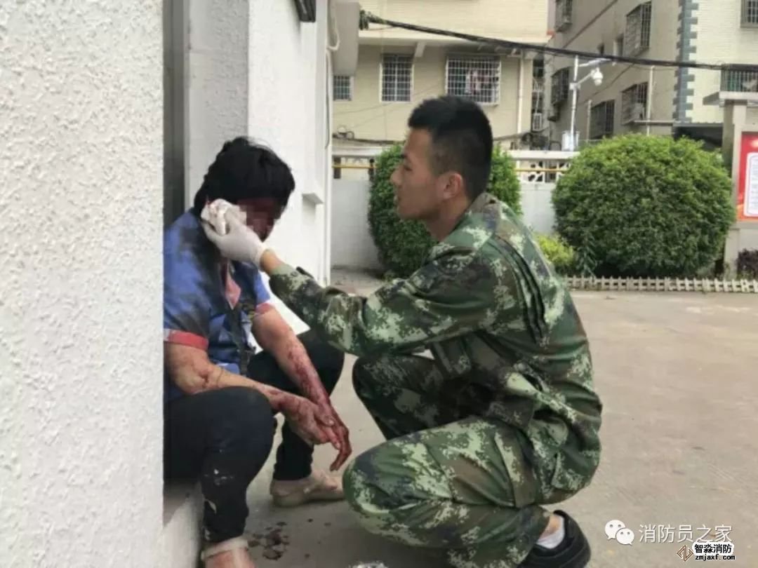 正在午休的消防員聞訊快速趕到事發(fā)現(xiàn)場,找到了全身鮮血淋漓蜷縮在路邊的保潔阿姨,為她擦拭血跡,并及時送往醫(yī)院。