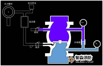 由供水設備(如穩(wěn)壓泵、高位水箱)供水,使系統(tǒng)充滿設計要求的壓力水,濕式報警閥閥瓣因自身重力而關閉。本系統(tǒng)在此狀態(tài)下,允許供水系統(tǒng)有波動,但不至于誤報。