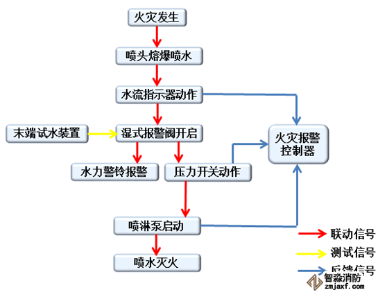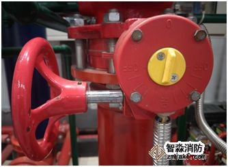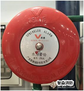 而發(fā)出聲光警報顯示火災區(qū)域。同時由于濕式報警閥的開啟,使一部分水流入報警管路,通過延時器延時后水力警鈴發(fā)出報警鈴聲,同時壓力開關動作向火災報警控制器發(fā)出反饋信號,火災報警控制器通過邏輯關系啟動噴淋泵。