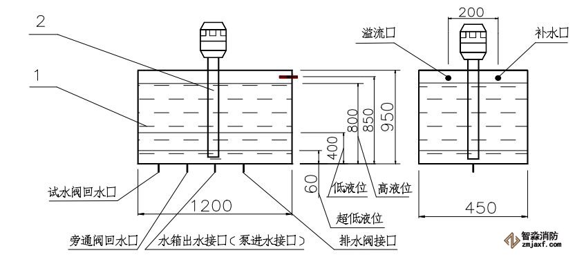 儲水箱在使用過程中,一是要確保向水箱注水時里面氣體順利排出,二是防止儲水箱里面水過滿,所以結(jié)合實際需要在儲水箱一側(cè)設(shè)置一滿液位溢水閥。