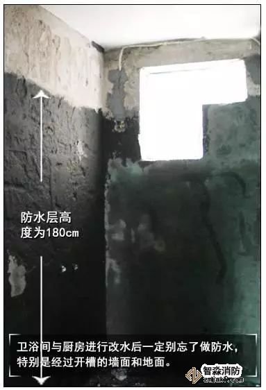 試壓完畢,繪制好給排水改造走向圖后,可以進(jìn)行封槽。封槽后墻面與地面都必須做好防水,衛(wèi)浴間墻面的防水層高度應(yīng)該做到180cm,廚房墻面的防水層高度做到50cm,做好墻面和地面的防水層,以防日后出現(xiàn)“表面冒汗”的情況。