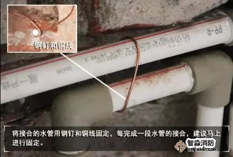 鋪設(shè)好一段管道后,須使用鋼釘和銅線對管道進(jìn)行固定。以免鋪設(shè)好的管道位置移位,造成不必要的麻煩。