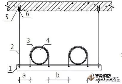 1.支架橫擔(dān) 2.鍍鋅螺桿 3.管碼 4.管道 5.頂爆螺栓 6.緊固螺栓